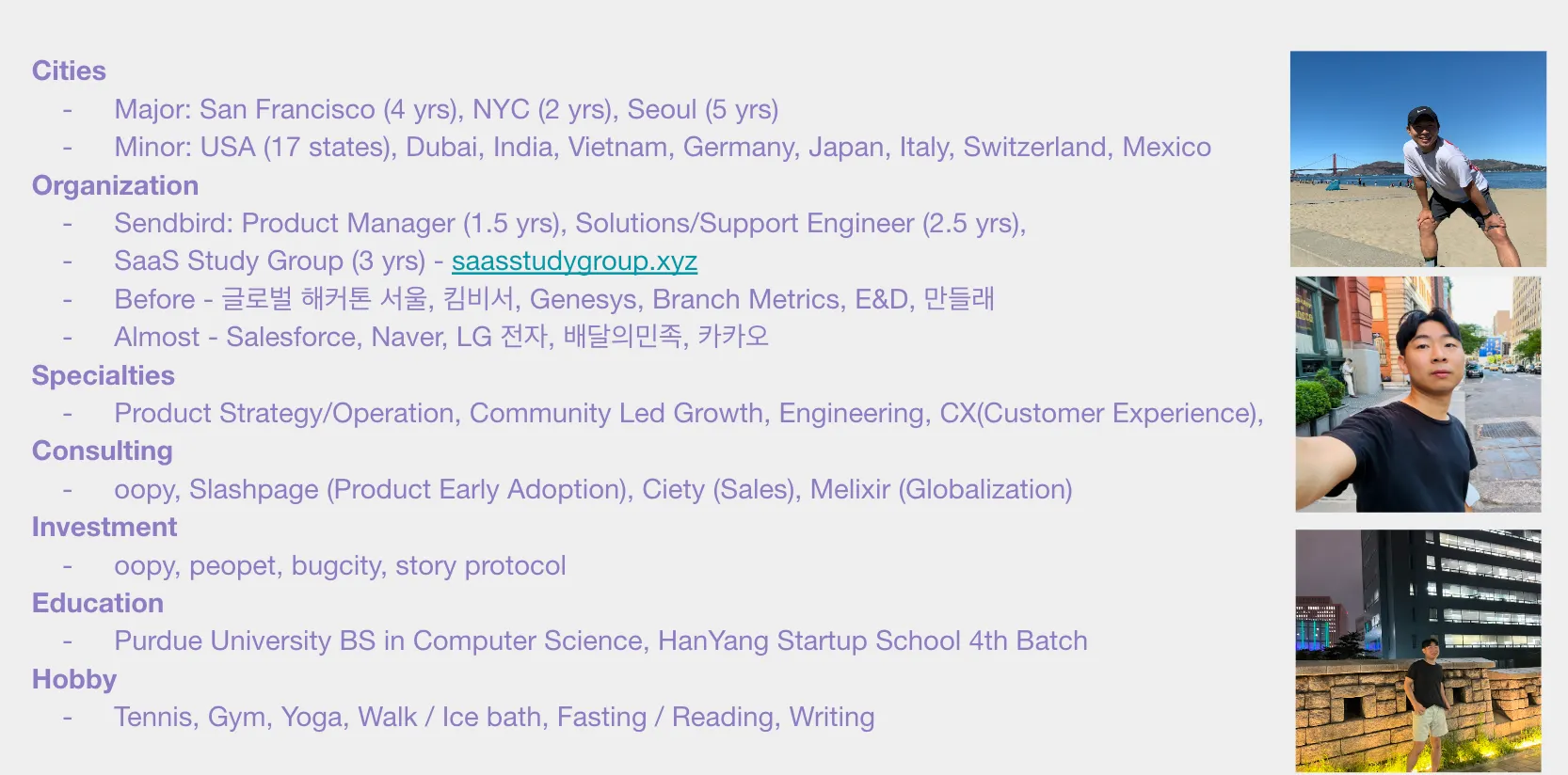 ENTP 이고요. Education, Investment, Startup, No-Code, Entrepreneurship, Creator, Web3, AI, Human Capital, Human Accelerator, Sushi, Wine, Travel 등에 관심이 많습니다.